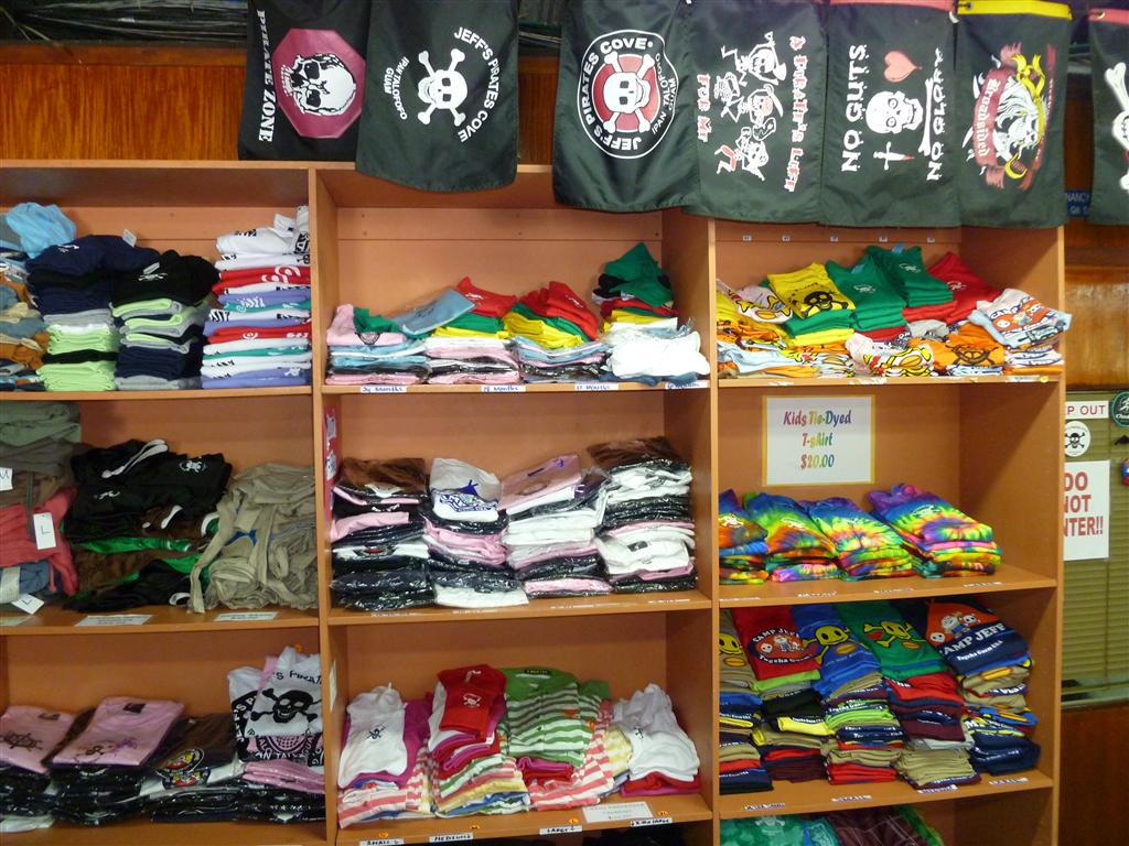 At the gift shop one can find plenty of "booty" that any self-respecting pirate would want. You have all the pirate apparel such as pirate t-shits, tye dye t-shirts, hats, head scarfs, eye patches, island style necklaces, trinkets, sarongs, water gear, even the hard to find pirate flags. You will be shivering ye ole timbers with excitement with all the variety of bounty found in Jeff's treasure chests.